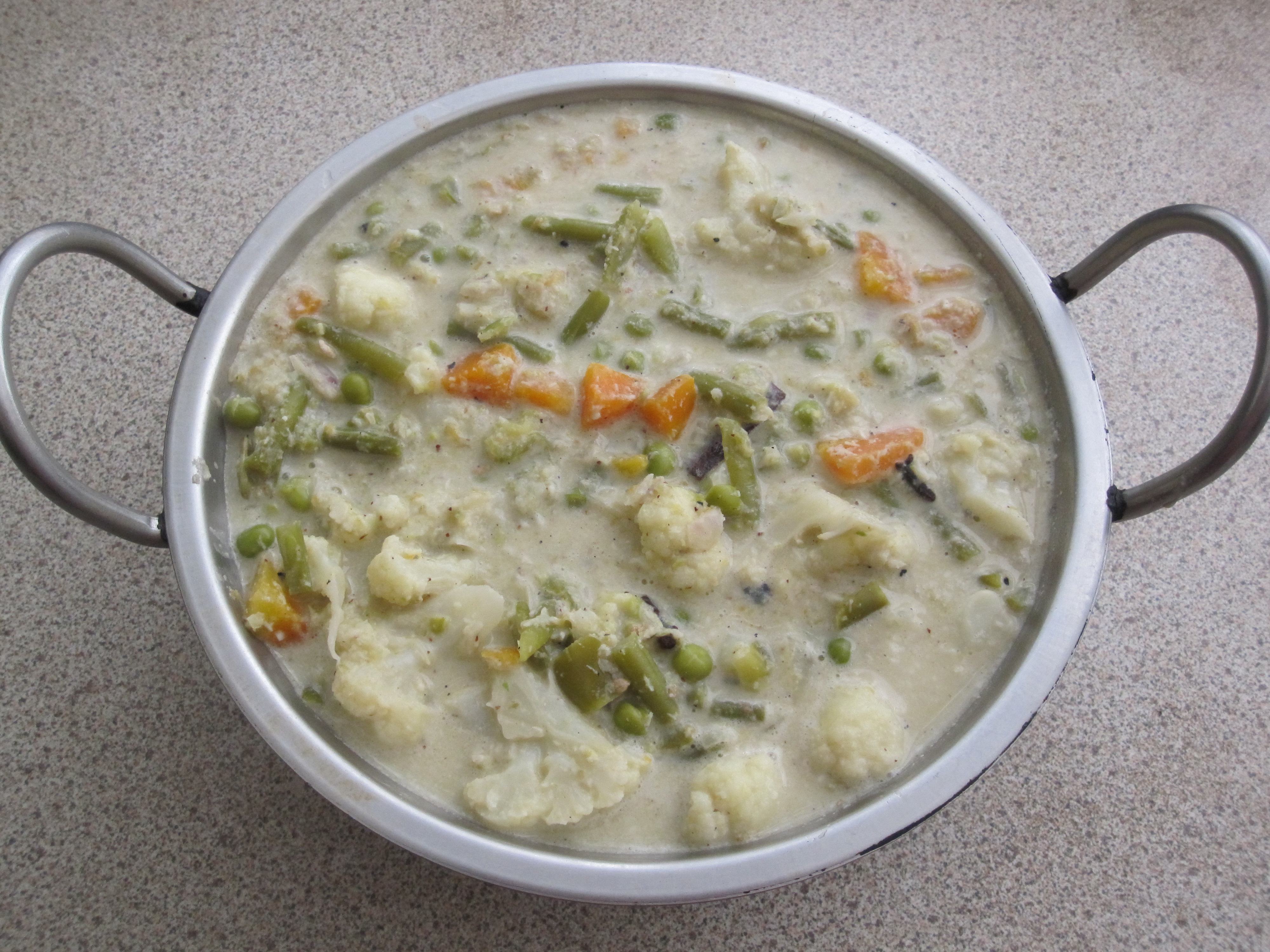 When we visited Tamilnadu, one of our friends Shanti served us this dish with ‘very simple’ in looks but ‘can’t stop licking the fingers’ kind of taste. She offered this kurma with hot idlis or steamed rice cakes. I could’nt really come to a conclusion to whether the colour of it or the subtle taste of the vegetables cooked in coconut paste and spices made it so appealing.