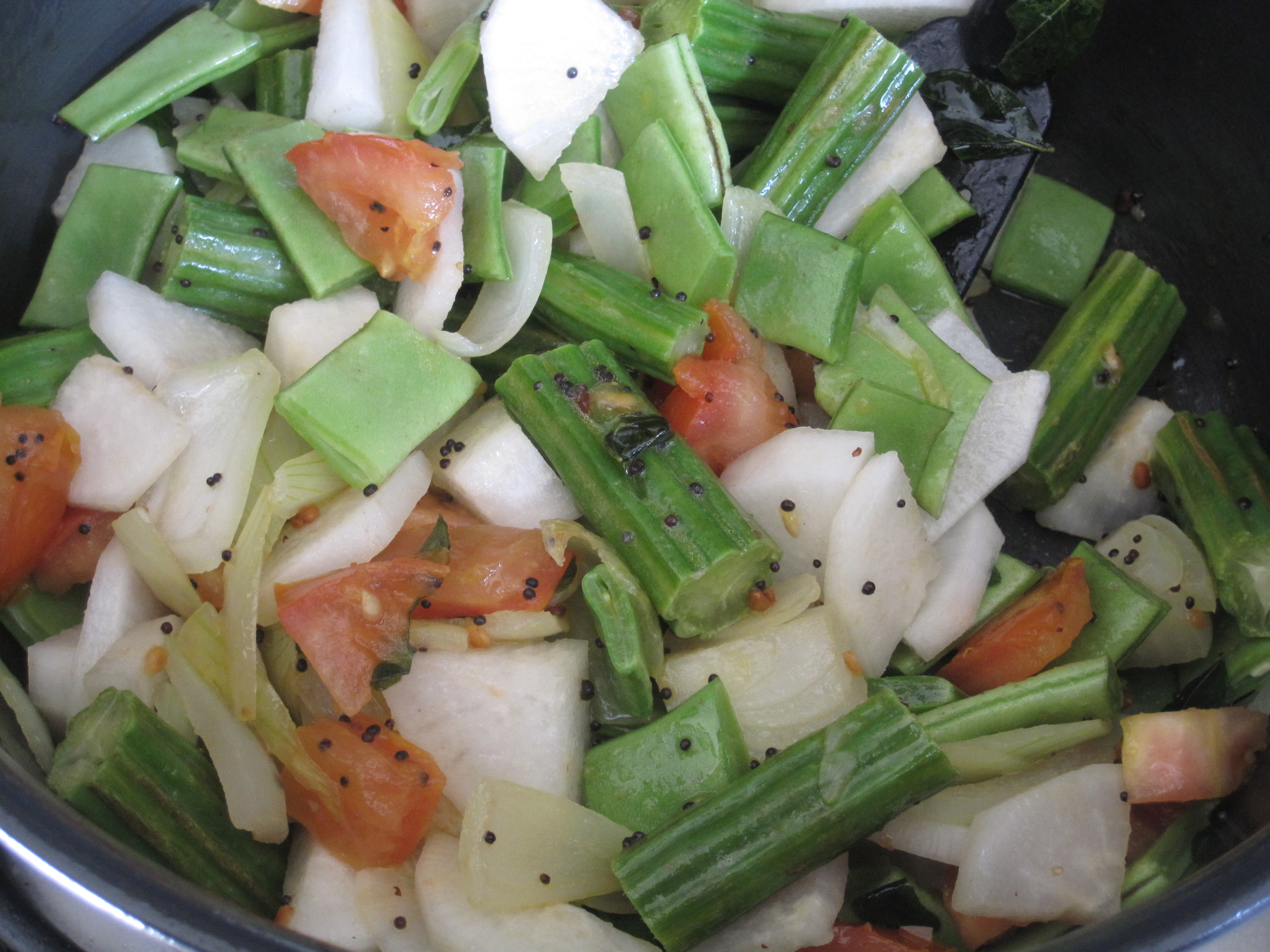 - Add more water if needed and close the vessel with lid and let the vegetable cook in the tamarind juice and sambar powder