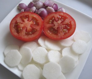 - Add chopped tomatoes, fry for a while and add sliced radish