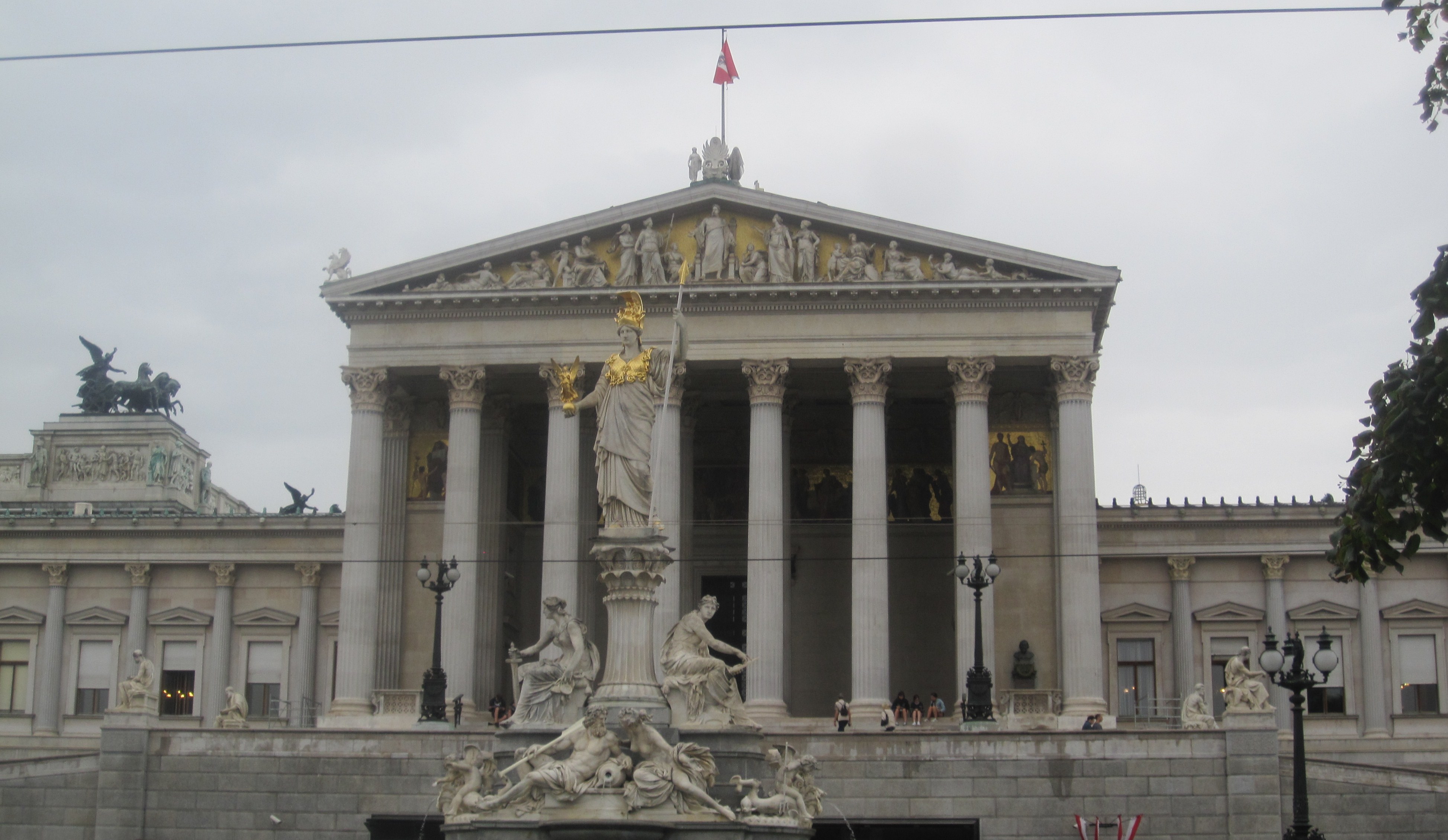 The main entrance is a copy of the doorway of Erechtheion on the Akropolis in Athens. The walls are decorated with marble and Greek statues. Behind the entrance the visitor encounters the Great Hall of Pillars. The 40 m long hall has 24 Corinthian style marble pillars. The capitals of the pillar are gilded with 23 carat gold and the marble floors are polished to perfection.http://www.gothereguide.com/austrian+parliament+building+vienna-place/