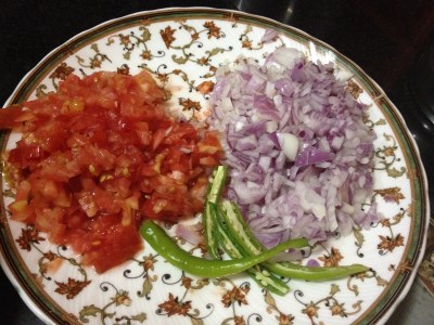 - Finely chop onions and tomatoes and slit green chillies.