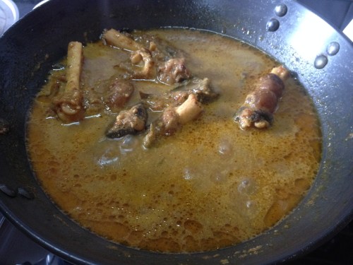 - Let the pressure release by itself, then open the cooker. The trotter curry would be almost done and would taste good if the Paya is cooked well. But we are not finished… The curry hasn’t reached its perfect consistency.