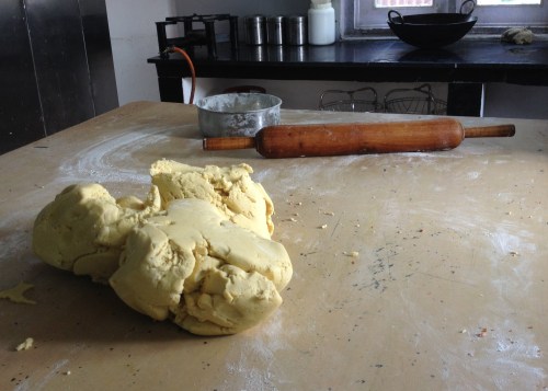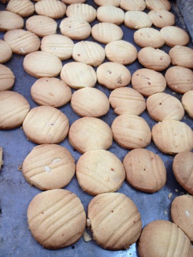 These biscuits are made with all purpose flour, margarine, sugar, salt, baking powder and a few more preservatives added to the sugar and flour for packaging purposes.. The ingredients used here are for bulk packaging, and henced provide us a basic understanding of baking biscuits on a larger scale. But, it is the process of making that made the workshop interesting – the swiftness of those hands in kneading the dough, rolling out evenly on the table, sprinkling nuts, cutting them into perfect pieces, arranging in huge trays and placing in several racks and the most important of all – baking to perfection.