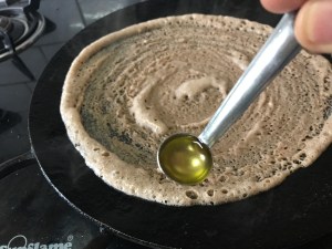 3. Pour droplets of gingelly oil on the sides of the Dosai for easy lift of pancake.