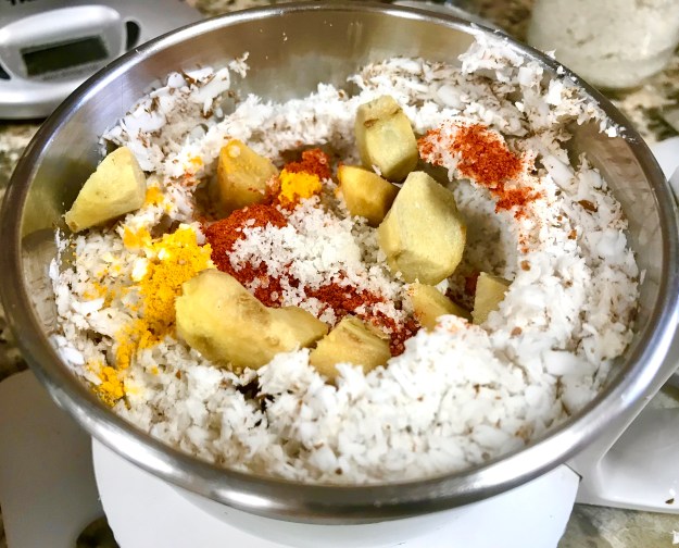 2. In a mixie jar, grind coconut, powders- (turmeric, chilli, salt) and ginger into a smooth paste