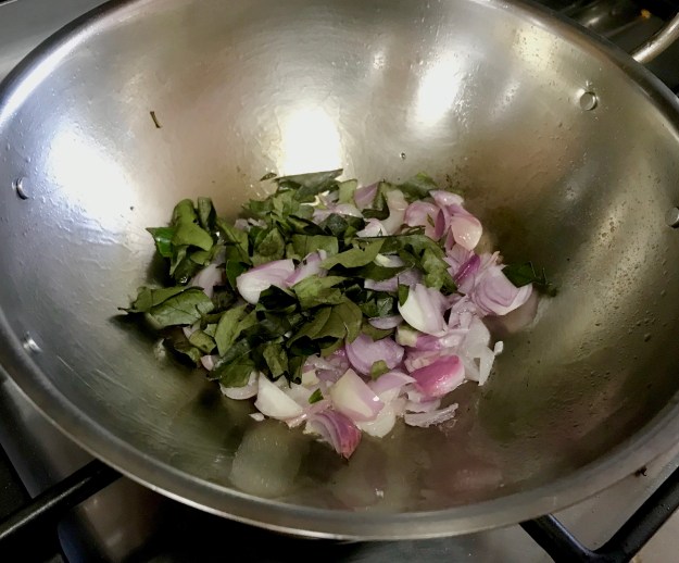 12. Heat coconut oil and add sliced shallots and curry leaves