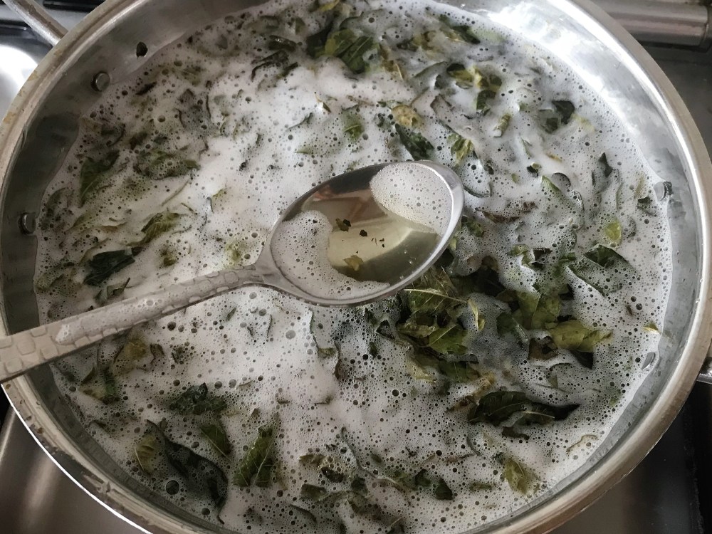 3. Once the oil starts to heat up, simmer the stove and let the leaves cook in oil for about 30 minutes, till the colour of oil starts to darken.