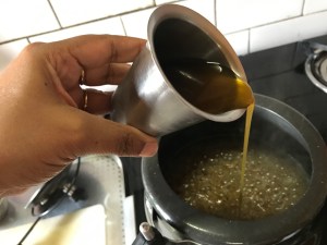 - Boil jaggery with water to dissolve and remove impurities. Strain and keep aside