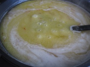 3. Then the quintessential cashew nut powder is added. No beater here and notice the color change of batter from white to ivory.