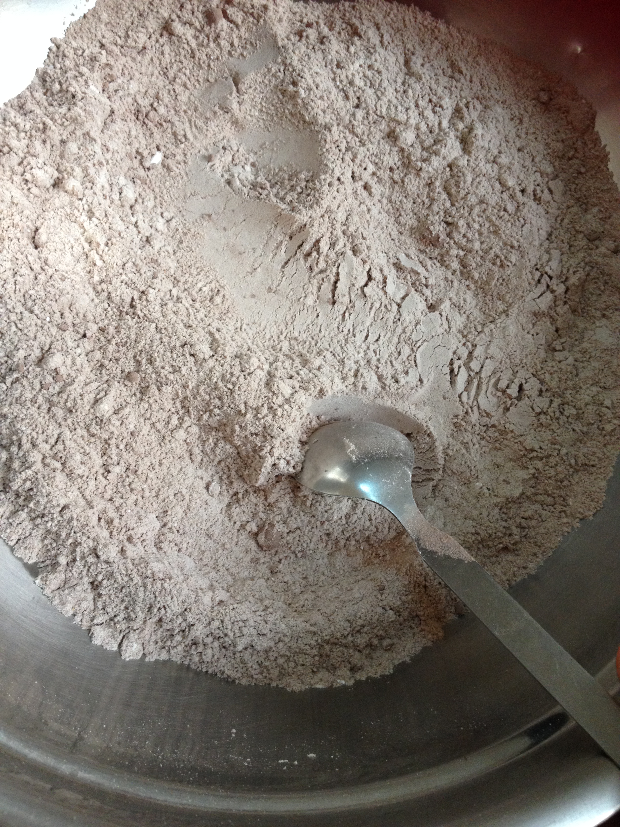 - Combine whole wheat flour, baking powder and cocoa powder and keep aside