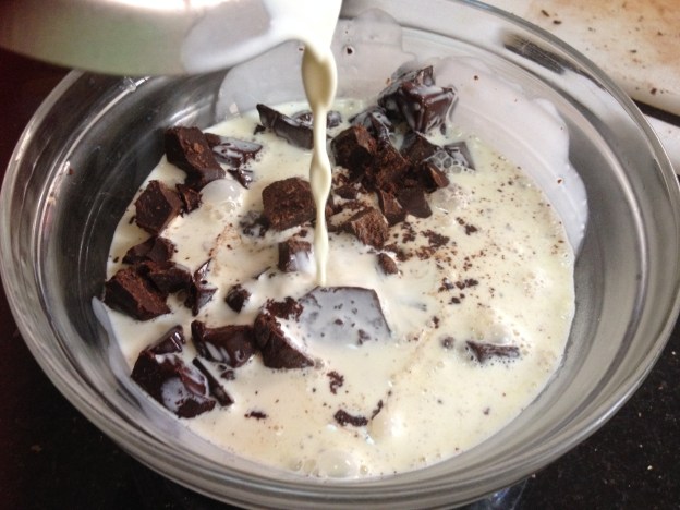 - Pour the cream over the chocolate pieces and let it melt – this might take 5 minutes