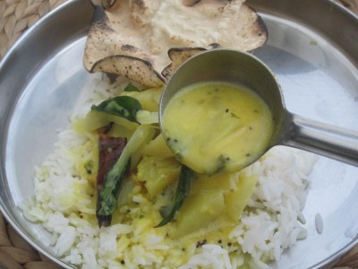 - three of the side dishes – up left corner – Pappalikkai Poriyal (Raw Papaya Dry Vegetable Curry), middle – Keerai Kootu (Spinach Stew) and next – Avial (Mixed Vegetables in coconut and curd gravy)