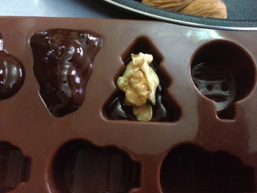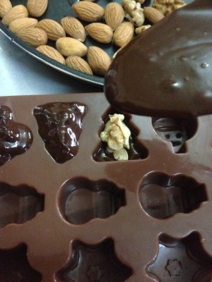 So,first step – feel free to choose your favorite – milk chocolate, white chocolate, dark chocolate with 50-70% cocoa or the bitter lot – 80%-90% cocoa. I chose to combine 80% and 90% cocoa bars, as my family loves bitter chocolate. Any chocolate you use – follow these simple steps to get your own nutty chocolate. Also, choose your own filling – I filled them with almonds and walnuts. Raisins, dates, dried prunes, dried berries, hazelnuts, pecans, peanuts and many more can be suitable variants. For a beginner like me, I thought nuts or dried fruits might be the better fillings than making cream or caramel centres.