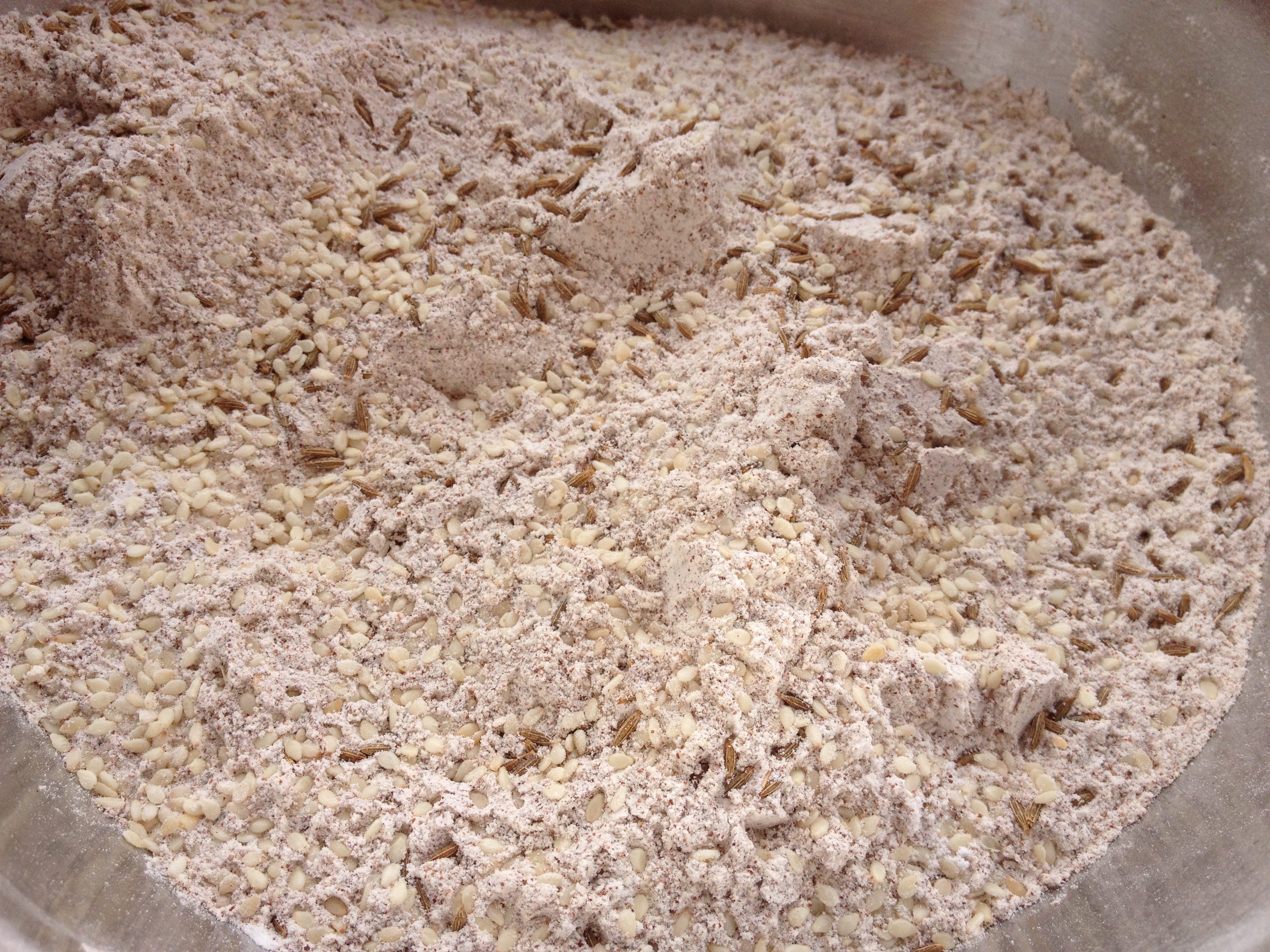 4. Mix sieved gram flour, rice flour, garlic paste, red chilli powder, asafoetida powder, carom seeds with water, salt, oil and clarified butter with enough water into a tight dough