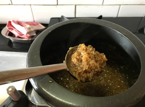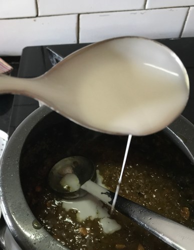 8. While using store-bought canned coconut milk – dilute 1/4 cup milk with 1/4 water and add at this stage, or if using home-made coconut milk from scratch, add the second milk (not so thin) after the rice is cooked with jaggery.