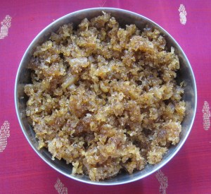 - Strain the jaggery syrup to coconut and fry till coconut absorbs most of the water