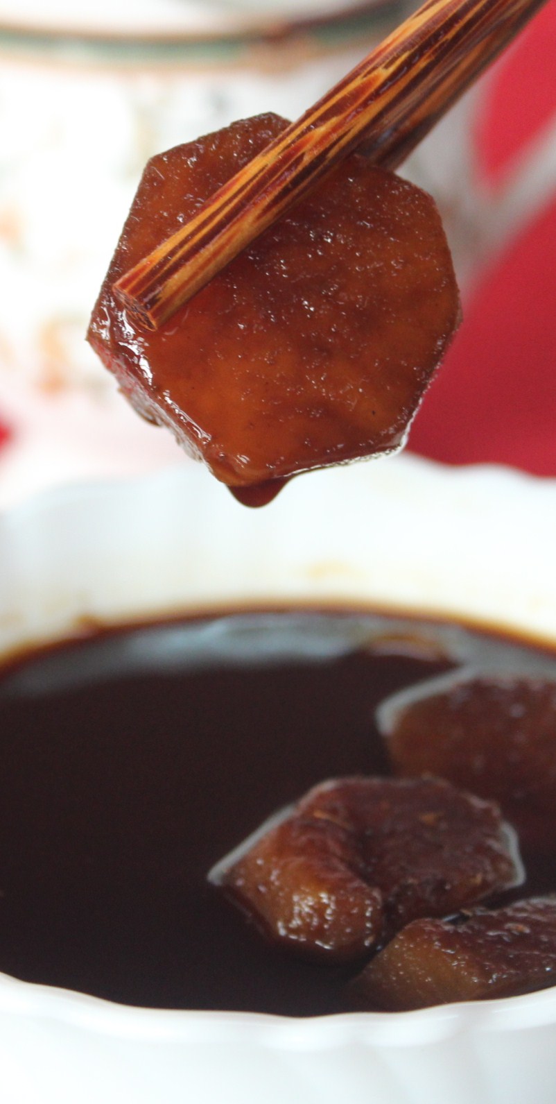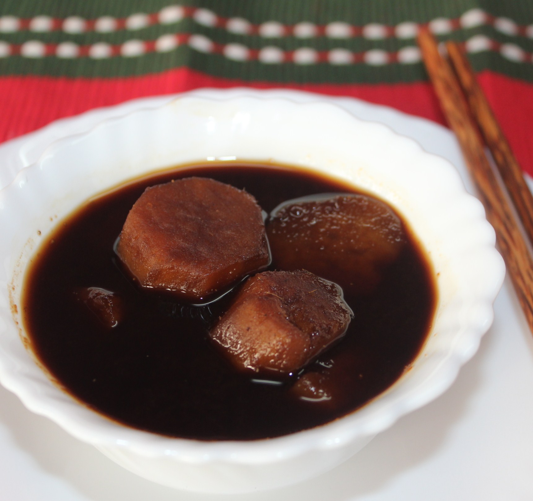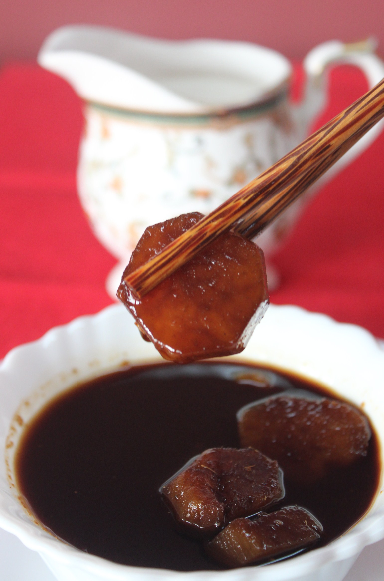 Biji Salak – Sweet Potato Dumplings cooked in Palm Sugar Syrup and flavoured with coconut milk and Pandan (screw pine) leaves and thickened with tapioca flour