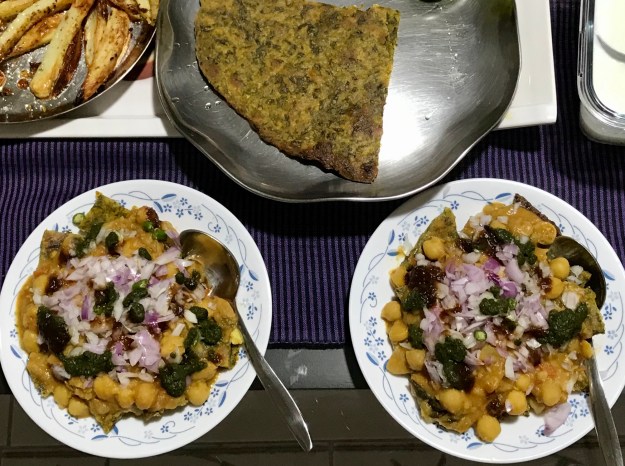 Who said Papdi Chaat needs Papdi or the crisps made of white flour. I chose to combine Papdi and Chole into a Chaat, but with a healthy twist. No matter you like it or not, its a whole meal. When I had my Methi (fenugreek leaves) Paratha dough in hand, I rolled a big pizza base out of it, and baked till crisp. That became my Papdi to go with the left over Chole curry. Add ons – home made green chutney, tamarind chutney and yoghurt.