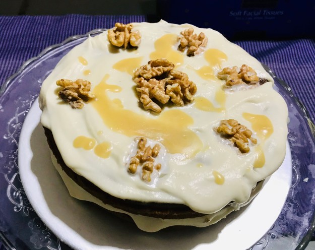 Time for a nice cake – Sticky Date and Walnut Cake – obviously with whole wheat flour and cane sugar, and eggless too. This time, I topped the cake with caramel whipped cream. With my home-made caramel, I could limit the sugar in the frosting.