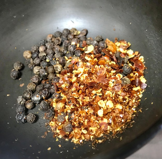 3. Dry roast pepper corns and red chillies (as I had some home made chilli flakes, I used it too.) 4 chillies would be needed for the recipe. Since I also used the left over chilli flakes, I took 2 red chillies