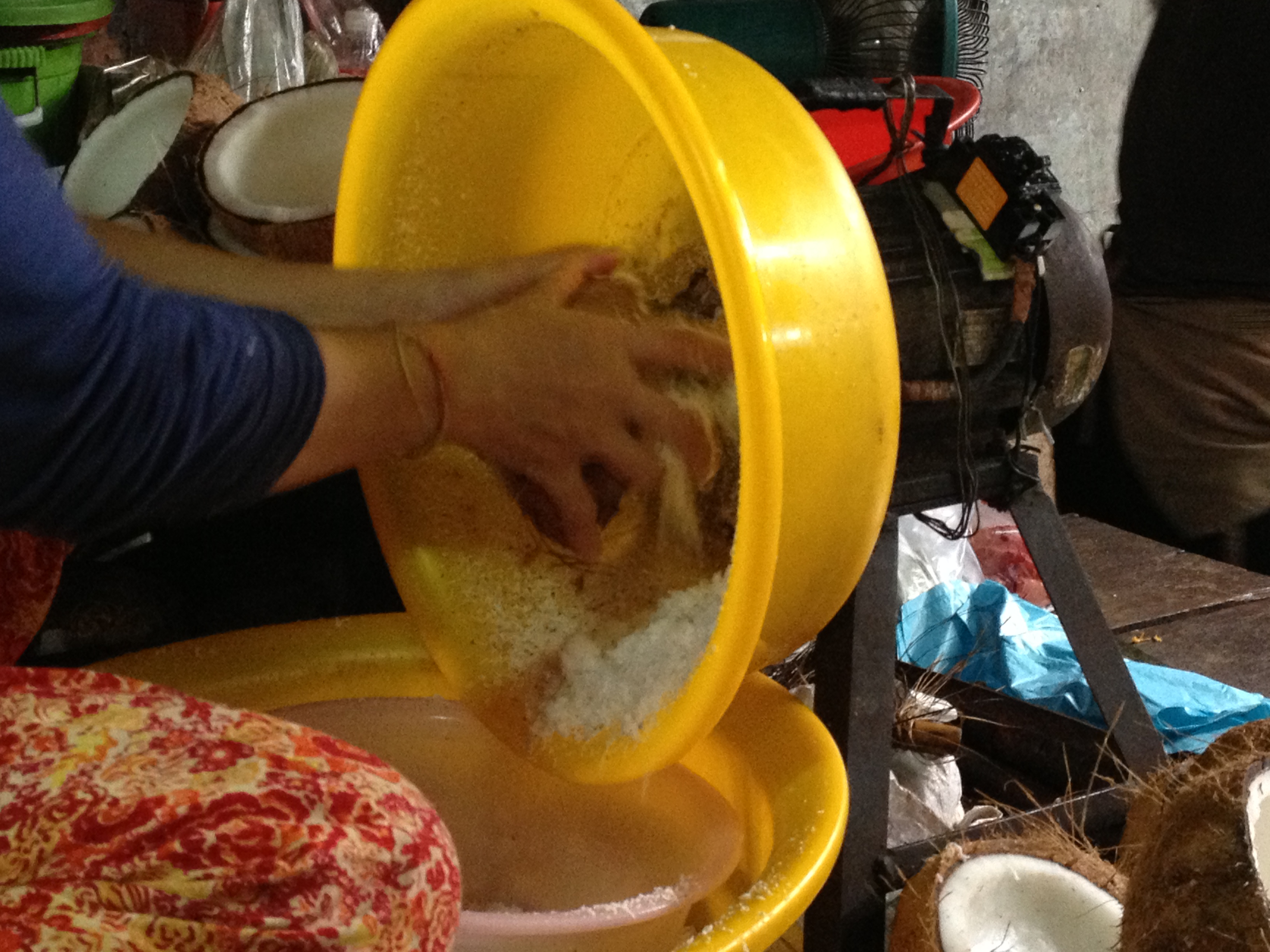 The south of India uses more coconut in cooking. Buying coconut and grating in not a problem anymore. In the market, you choose your coconut and the vendor grates it in front of you. It looks like an indigenous coconut grating machine made from local items.. very interesting!